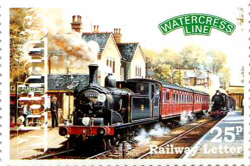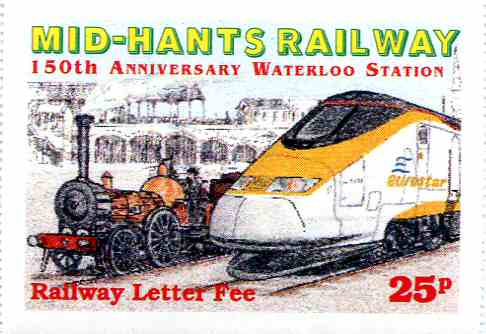 Multicoloured. LSWR locomotive, Eurostar Power Car and Waterloo Station, c. 1848.